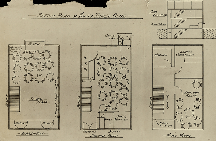 Rather than the glittering resort of rich city magnates, Superintendent Martin’s view of the club was quite different. He described the ‘Forty-Three’ in the following terms “decorations and furniture are tawdry, rooms are dirty and the whole are typical of what the Club is – a low class night haunt.”