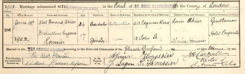 Madame Ahier was born Marcelline Houssier on the 14th January 1891 to French parents who moved to London around the turn of the century. Her family were all employed in the hospitality trade as hotel proprietors, restaurant keepers, waiters or cooks. Traces of her early life are scarce but in June 1908 she married Abel Fernand Ahier at St. Anne’s Church in Soho. She was just seventeen years old.